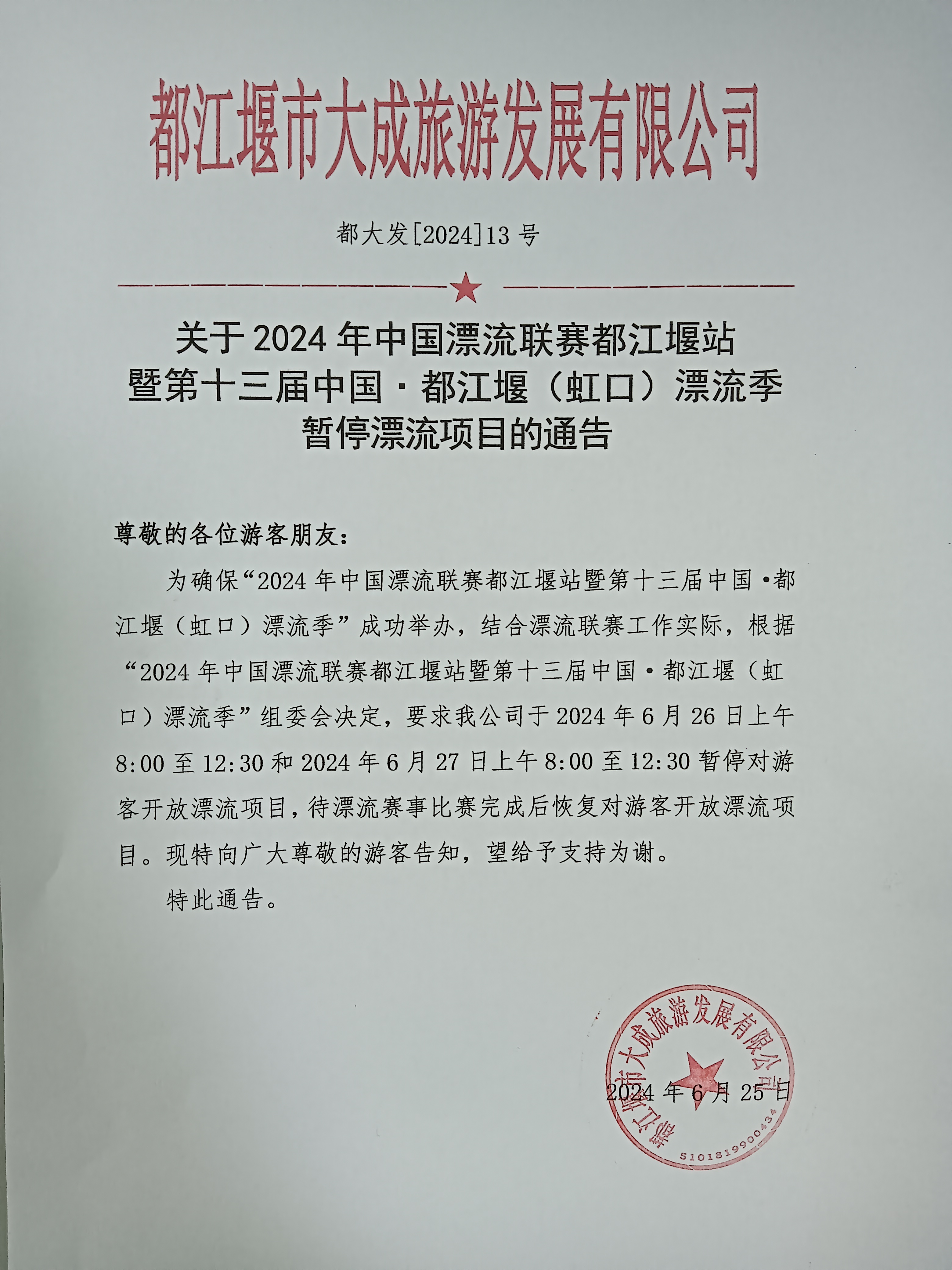 关于2024年中国漂流联赛26.27号上午暂停漂流项目的通告